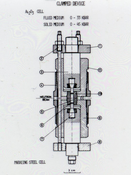By using aluminium oxide (Al2O3) for the body of the cell, 30 kbar (3 GPa) can (in principle) be attained, at the price however of a smaller volume sample(0.5 cm3). The real pressure inside the cell is estimated by measuring the lattice parameters of a sample of NaCl placed inside the cell below or above the sample being investigated. In the early days (1978-1980) the cell was brought up to pressure at the CNRS. Later the ILL acquired a 6-7 kbar compressor unit and cells (Louis Mélési). The first neutron experiment was carried out by B. Renker in 1980.