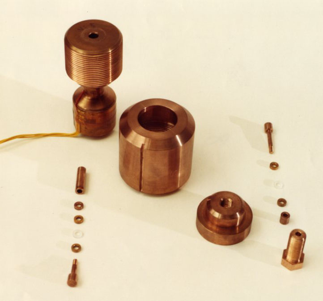 The 5-6 kbar provided by the gas cells were far from sufficient for the scientists. This led to another series of pressure cells being developed in parallel by J. Paureau, in collaboration with D.B. McWhan (Bell Labs), who came to spend a sabbatical year at the CNRS in 1974-1975 [4]. These were 'clamp' cells, with the pressure being generated by a liquid rather than a gas. Clamp cells can reach higher pressures with a far lower level of risk, given that far less energy is stored in the cell (liquids, unlike gases, are incompressible).