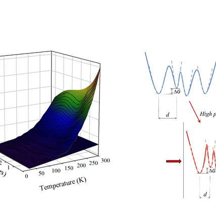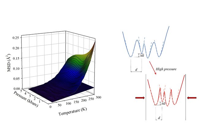 The effects of pressure on the energy landscape of proteins and on their internal dynamical properties are the subject of a study recently published in Scientific Reports. The study arises from a collaboration between researchers from ILL and Université Grenoble Alpes, from the Institute of Biophysics of the Italian National Research Council (IBF-CNR, Palermo, Italy), and from the Physics and Chemistry Department of the University of Palermo (Italy). In this work, the dynamics of myoglobin was studied in a wide range of temperature and pressure. For the experiments, performed on the IN13 backscattering spectrometer, a highly viscous, deuterated, glycerol-protein-water sample was used, suitable for pressure transmission at cryogenic temperatures and for a precise detection of the relevant protein internal motions. The results show that high pressure reduces protein motions, but does not affect the onset temperature for the Protein Dynamical Transition. This indicates that the energy differences and barriers between conformational substates do not change with pressure. Instead, the observed reduction of protein internal motions observed at high pressure must be ascribed to a corresponding reduction in the average structural differences between the accessible conformational substates, which means an increase of the effective roughness of the free energy landscape of the system (see figure).