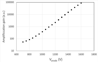 The high voltage required to detect neutrons in normal operation is 800 V; we tested the detector at 1600 V over several hours and encountered no problems. The gain at 1600 V is 3 orders of magnitude higher than at 800 V. This is a good indication of high robustness.