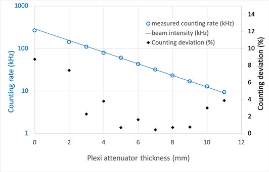 The counting rate curve was measured on the CT2 instrument with a collimated beam of 7 mm x 7 mm. Different thicknesses of plexi attenuator were installed 2 metres upstream of the detector. The 10% deviation from the fit in Figure 3 corresponds to the usual definition of the maximum counting rate. The measured value of 300 kHz corresponds to 100 kHz/channel and 6 kHz/mm2, exceeding the specification of D20 (50 kHz/channel).