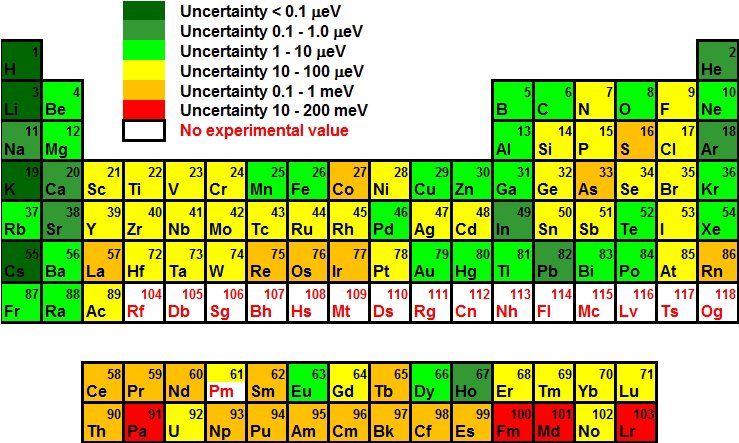 The colour coded Periodic Table shows the uncertainty with which ionization potentials of the chemical elements are known today. Prior to the present work no experimental value existed for element 61, promethium, now it has been determined with an uncertainty of 40 μeV (40 micro electron Volt), i.e. with better precision compared to its neighbouring stable elements.