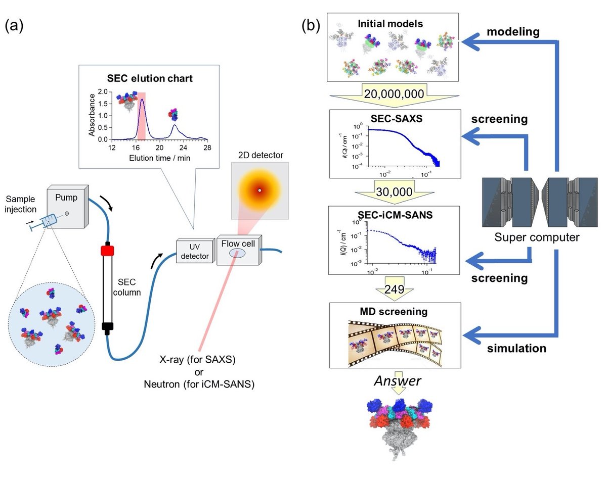 Figure 1. (a) Schematic illustration of SEC-SAXS and SEC-iCM-SANS: Component-separation by SEC provides selective acquisition of the ABC complex scattering profile. (b) Computational analysis flow chart: using computational modelling, construction of 20 million structural models of the ABC complex covering all possible KaiA conformations; followed by screening based on a set of data provided by SEC-SAXS and SEC-iCM-SANS experiments. The surviving models were subjected to molecular dynamics simulations to examine their stabilities.