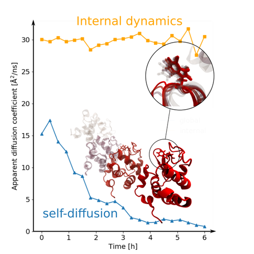 Surprisingly, the internal protein dynamics on the nano-to picosecond time scale does not change during the entire aggregation process. The center-of-mass diffusion, on the other hand, decreases as aggregation proceeds and can be well explained by a single exponential process.