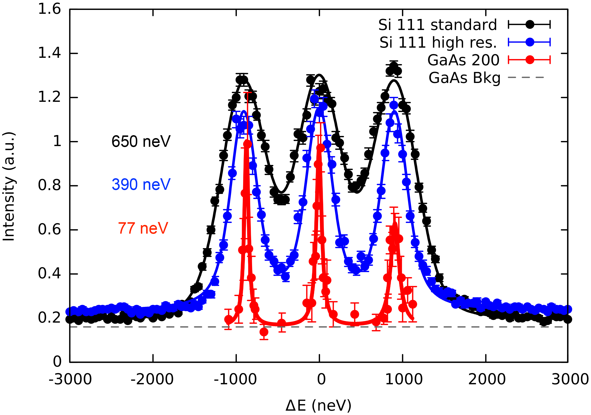 The GaAs project is a prototyping of a higher-resolution backscattering spectrometer using the GaAs 200 reflection, which has a 10 times smaller Darwin width than the usually used Si 111. Several challenges have been met along the way to reach a significant improvement like the single crystal quality (collaboration with Freiberger Compound Materials GmbH), precision of alignment and compensation for gravity. During the commissioning of a GaAs prototype, a world record in energy resolution of 77 neV FWHM has been achieved (see Fig. 2), which presents the first major improvement in energy resolution since the invention of neutron backscattering 50 years ago.