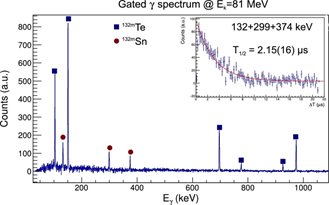Figure 1: γ spectrum recorded on the LOHENGRIN spectrometer. Specific γ-rays allow identifying unambiguously the isomeric state of the Sn-132. Other γ-rays are those of Te-132 since the LOHENGRIN spectrometer selects only the mass (here 132) and not the nuclear charge of fission fragments