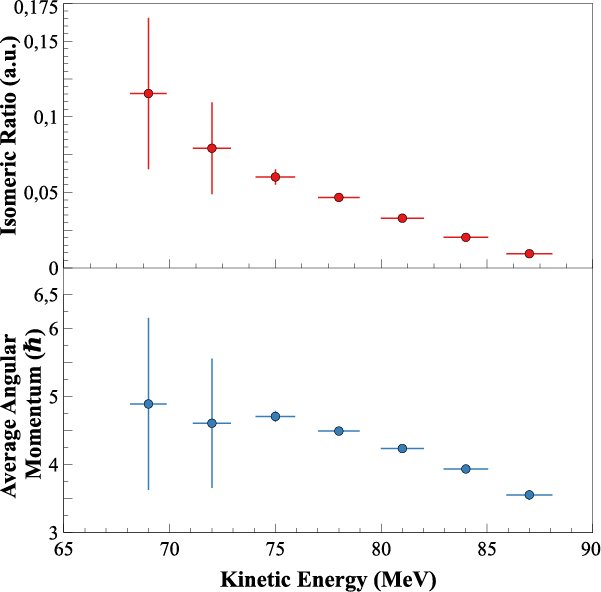 Figure 3: (top) Measured isomeric ratios as a function of the fission fragment kinetic energy. (bottom) Derived averaged angular momentum as a function of the fission fragment kinetic energy