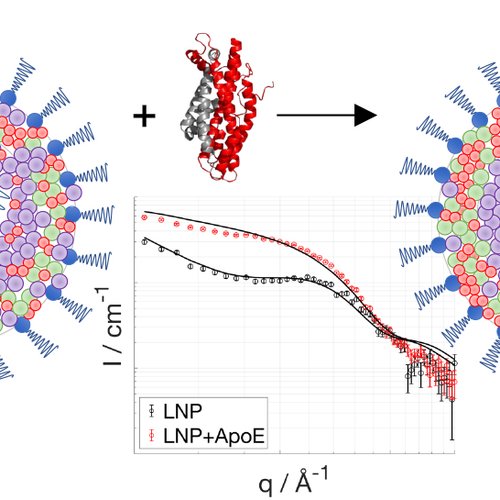 ApolipoproteinE (ApoE) is a serum protein that binds to LNPs and is known to be critical for cellular uptake and protein production in the liver. “While it is well known that serum proteins bind to LNPs once administered, little work has been done to study whether this binding actually affects the LNP,” explains Sebastiani. “A novel aspect of our work was the acquisition of complementary SANS and SAXS data of mRNA-LNPs after 3 hours incubation with ApoE in order to investigate the potential structural and compositional effects induced by binding.” The results demonstrated that ApoE binding causes a rearrangement of both the LNP surface and core structures, in particular, cholesterol is transferred from the LNP core to the surface, increasing the LNP surface cholesterol concentration. At a certain critical concentration, the LNP core packing fails and mRNA is released.