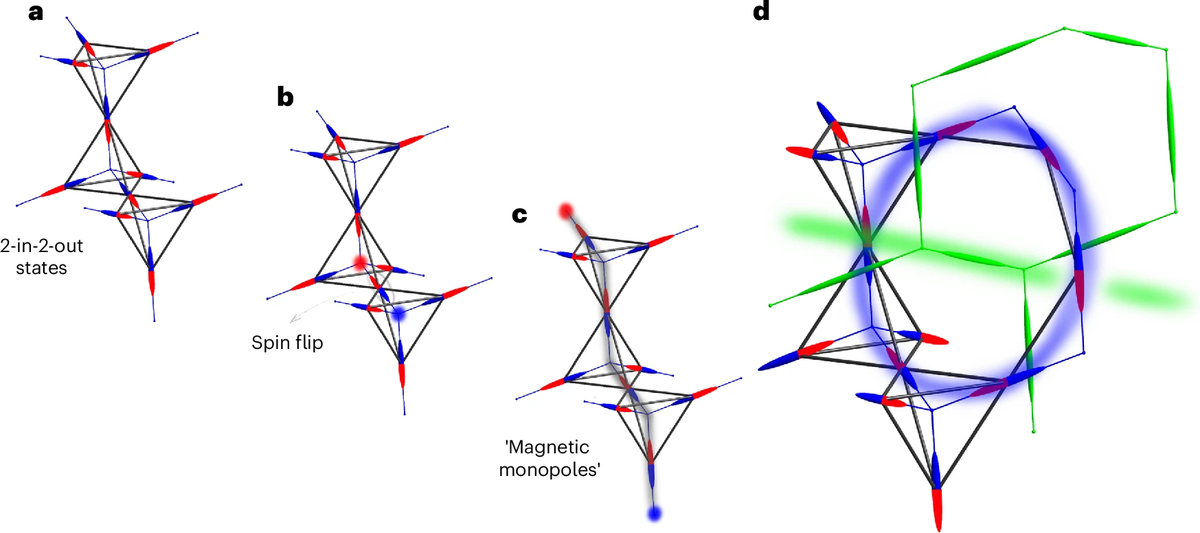 This occurs famously in the so-called rare-earth pyrochlores – inorganic crystals such as the compound Ce2Sn2O7 (Ce = cerium, Sn = tin, O = oxygen). On an atomic scale, pyrochlores consist of many small pyramids, which are known as tetrahedra. The corners of these tetrahedra are occupied by magnetic ions whose moments follow the "2 in, 2 out" rule: two of them are oriented inwards of the tetrahedron and two point outwards.