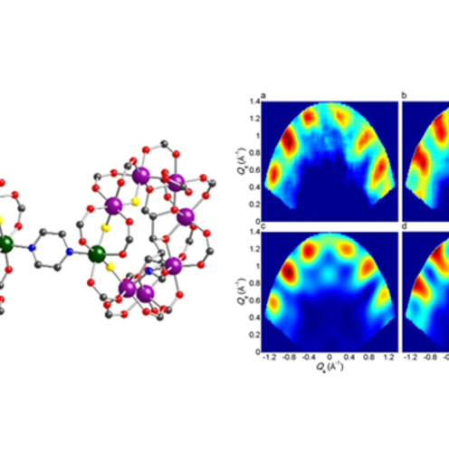 In today’s Nature Communications publication, fruit of the collaboration between scientists of the Institut Laue-Langevin (ILL), the University of Parma, ISIS and the University of Manchester, the (Cr7Ni)2 dimer has been used as a benchmark system to demonstrate the capability of ‘four-dimensional’ inelastic neutron scattering to investigate entanglement between molecular qubits3. By utilising high-quality single crystals and the full capabilities of the time-of-flight spectrometer IN5, the team was able to demonstrate and quantify the entanglement through the huge amount of data they were able to extract from the 4D phase space (Qx,Qy,Qz,E), where Q is the momentum-transfer vector and E the energy transfer. Indeed, the neutron cross-section directly reflects dynamical correlations between individual atomic spins in the molecule. Hence, the corresponding pattern of maxima and minima in the measured neutron scattering intensity as a function of Q is a sort of portrayal of the entanglement between the molecular qubits. Furthermore, the team has also developed a method to quantify entanglement from INS data.