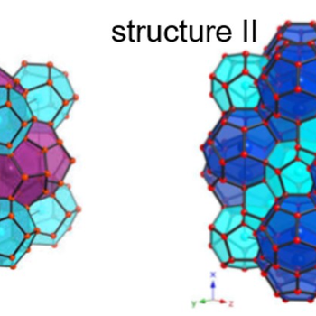 On the molecular scale, gas clathrate hydrates are characterised by polyhedral water cages of different shapes and sizes. Those cages can be combined in different ways to form a crystalline structure. Four different structures are known so far and the two most common among them are generally referred to as clathrate structures I and II. The gas molecules or atoms occupy the centre of the cages; they are efficiently trapped and can barely escape.
