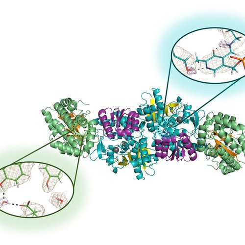 Now let’s bite off a second piece: “the internal aldimine form of tryptophan synthase". So we are told that TS is in the “internal aldimine form”. There’s quite a bit of biochemistry behind these three words, but what we need to understand is actually simple. Some enzymes require the addition of a small molecule, called a cofactor, in order to function. The cofactor for TS is pyridoxal 5′-phosphate, or PLP for short. PLP is the active form of vitamin B6, which is present in practically all forms of life and is crucial for countless cellular functions. The internal aldimine is simply a stable enzyme–PLP complex. PLP-dependent enzymes are particularly interesting because they form a large and versatile family of enzymes that are common to many organisms and include many that play a role in human diseases or are of interest in enzyme engineering applications. Despite this obvious interest, important questions remain about how PLP-dependent enzymes really work.