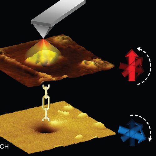 The electric polarization P and magnetization M are linked to each other and are both switched by the application of an electric field applied using the tip of the AFM which is illustrated schematically.