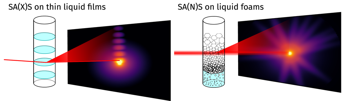 Figure 2. Schematic representation of a typical SAXS experiment on single foam films and a SANS experiment on a three-dimensional foam. Small-angle scattering can effectively probe the structure of liquid foam at characteristic lengths up to 100 nm, and both neutron and synchrotron radiation can be used to probe the structure of single liquid films or three-dimensional foams.