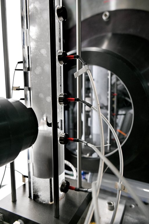 Fig 1. Foam setup during a neutron scattering experiment at ILL. Exactly the same foam column, which is coupled with conductivity measurements and macrophotography, can be used on the experiment and in the lab.