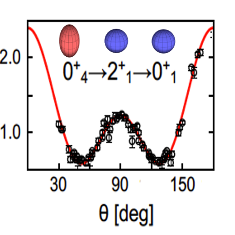 Angular correlations measured with FIPPS for the 0+4→ 2+1→ 0+1 gamma cascade, clearly showing the characteristic pattern of a pure E2 quadrupole decay, a key information for identifying the prolate deformed 0+4 state.
