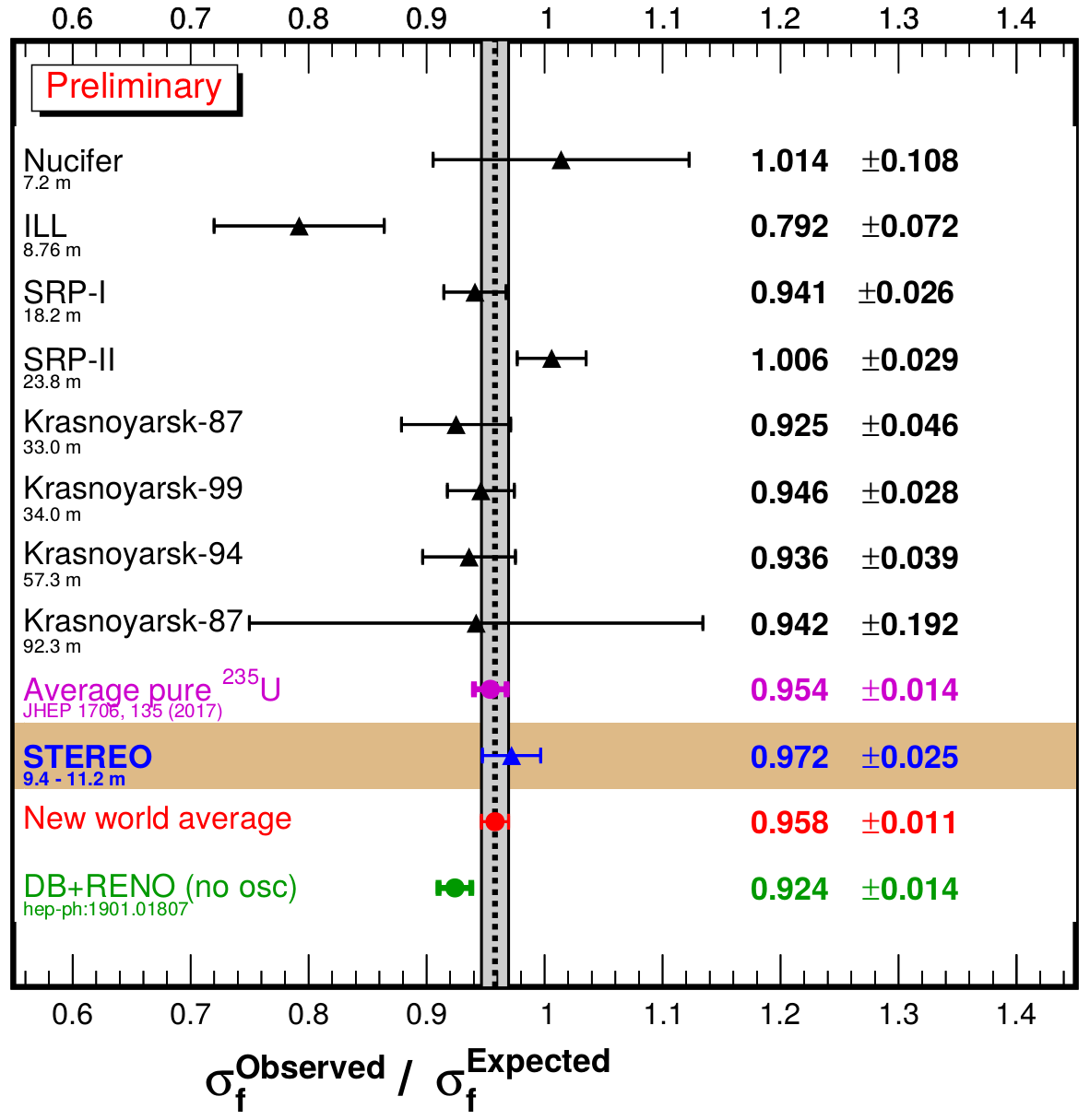 Figure 2: Ratio of the neutrino rate measured by STEREO to the expected rate (blue point). This new result is in good agreement with the previous set of measurements at reactors operating with a highly enriched nuclear fuel (black points and purple average). The new world average including the STEREO result is shown in red. An independent extraction of the 235U neutrino rate from the Daya Bay and Reno measurements at commercial reactors operating with mixed fuel is shown for comparison (green point).