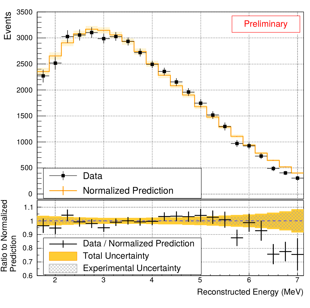 Figure 3: Neutrino spectrum measured by STEREO (black points) compared to the normalized prediction (yellow line, the area of the predicted spectrum is set equal to the area of the measured spectrum).