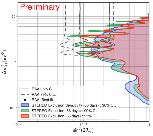 Figure: First results of STEREO. The 4th neutrino can be described by two parameters, the mixing angle sin2(2θee) (horizontal axis) and the difference of the mass squares Δm241 (vertical axis). The difference of the mass squares is related to the frequency of the oscillation between the anti-electronneutrino produced in the reactor core and the hypothetical 4th neutrino. The mixing angle describes the amplitude of this oscillation and is 0 if the 4th neutrino does not exist. In order to resolve the reactor antineutrino anomaly (RAA), the parameter pair (sin2(2θee), Δm241) must be inside the area indicated by the grey lines [2]. Because of the statistical nature of the experiments this statement holds with a certain probability which is indicated by C.L. (Confidence Level). The star shows the parameter pair that would best resolve the RAA [2]. The blue area shows the ideal exclusion sensitivity at the available statistical precision which would be obtained if all STEREO observables correspond exactly to the expectations without 4th neutrino. The first results of STEREO exclude the parameter space indicated by the green and the red area with 90% and 95% C.L., respectively. With additional data these areas will expand to the left. The objective of STEREO is to either fully exclude the RAA region below 4 eV2 or to find the parameters of the 4th neutrino.