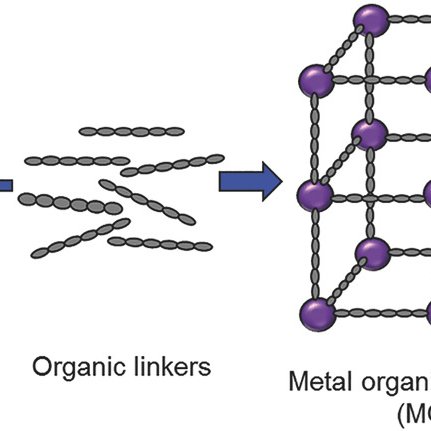 MOFs are porous materials that are made up of metal atoms linked by organic (carbon-based) molecules called ligands. Together, the metal ions and the ligands form crystals with large cavities, in which molecules can flow in and out.