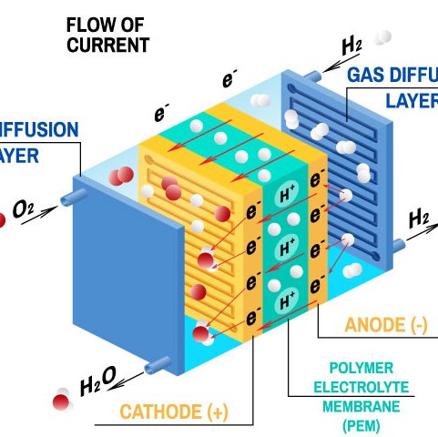Fuel cells generate electricity from an electrochemical reaction usually between hydrogen (as the fuel) and oxygen (from the air) with the only waste product being water. They offer a significant green option as a future carbon-free power source. Like all electrochemical cells they consist of an anode and a cathode in contact with a conducting electrolyte through which charge carriers – ions like hydrogen (H+) or hydroxide (OH-) can travel between the electrodes hosting the reaction sites.