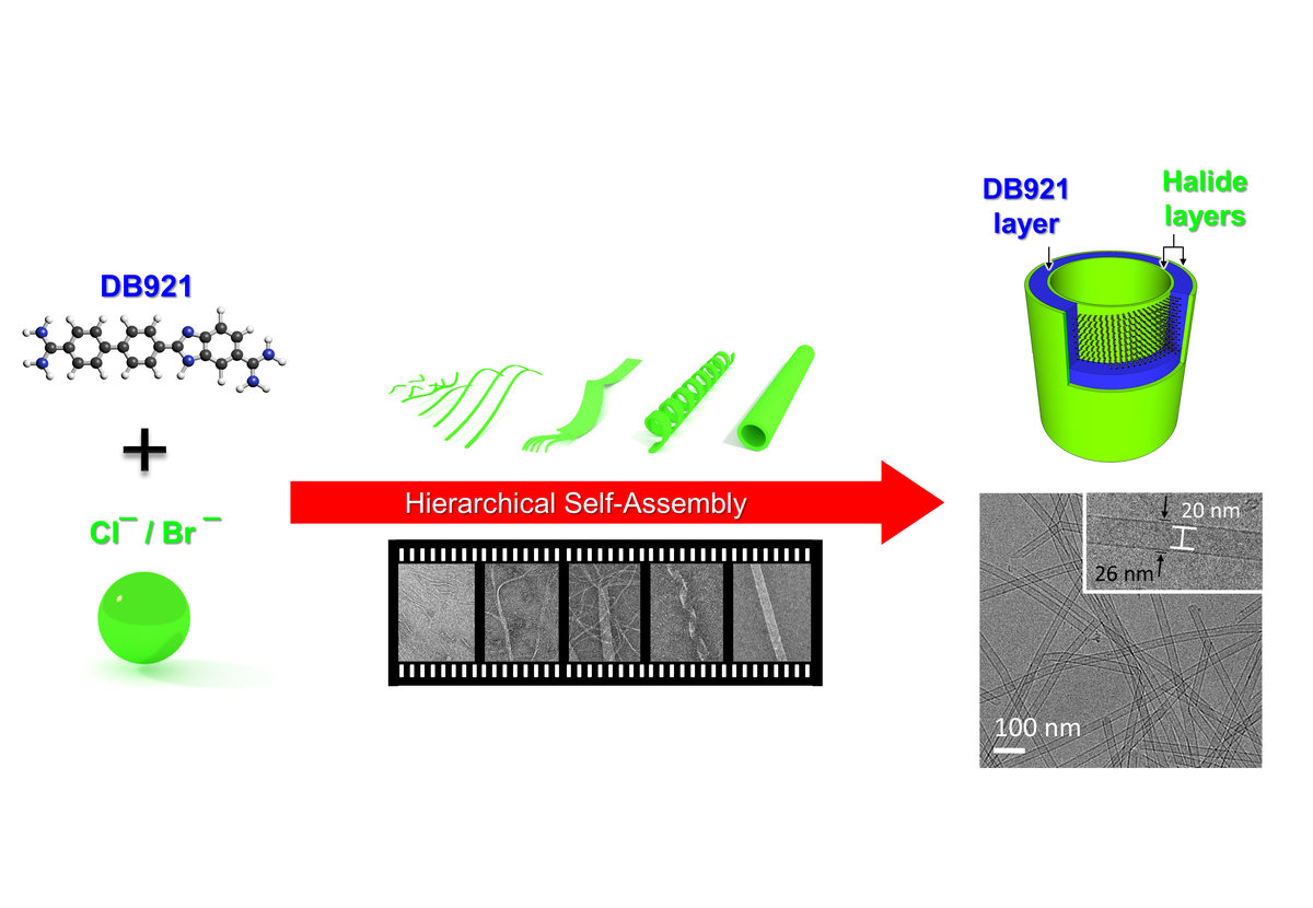 Furthermore, the nanotube’s highly monodisperse cross section was also found to be determined by DB921’s interaction with the surrounding salt, in addition to the molecule’s natural curvature. Consequently, different nanotube diameters can be explored by modulating the nature of the halide from chloride to bromide. These promising results highlight DB921 as an interesting candidate material for potential applications such as drug delivery, and future work will focus on achieving additional degrees of control over the assembly process.