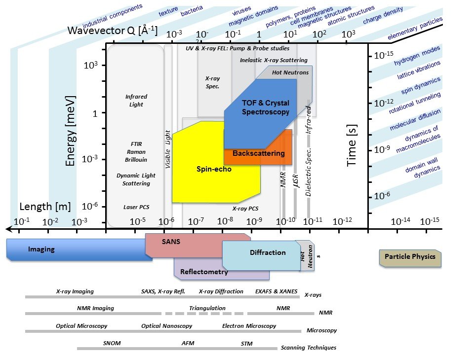 This figure shows the time and length (energy and wavevector) scales of the various neutron-based techniques (Courtesy: Ken Andersen). You can use it to identify the techniques which will best match your needs and then consult the list below to choose the appropriate instruments.