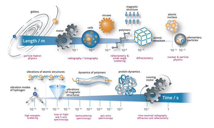 Neutrons can be used in many different ways to study structures that range from life-sized to the atomic scale and interactions that occur at very different rates. For example, a thermal neutron as a wavelengths of the order of the angstrom, which is roughly the distance between atoms in a crystalline solid. Having a wavelength of about that distance means that thermal neutrons are sensitive to atomic length scales. To probe the longer length scales characteristic of proteins, polymers and other “soft” materials, neutrons with longer wavelengths are needed.