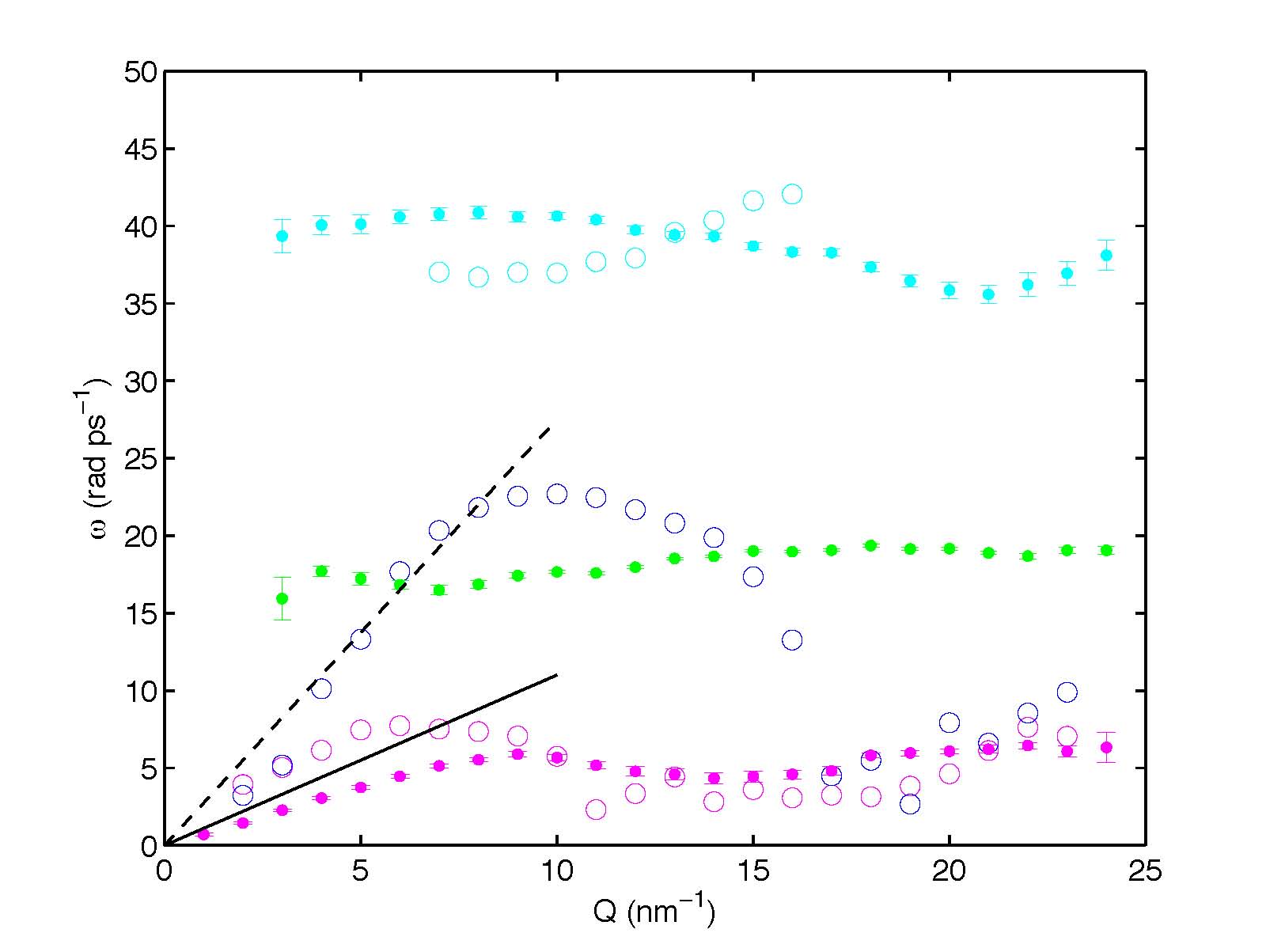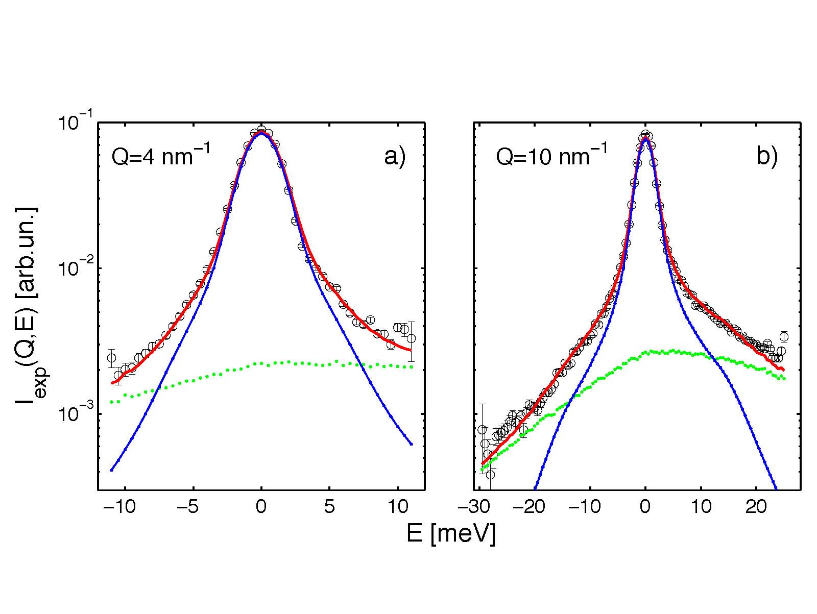 The comparison with the most thoroughly investigated HB system, liquid water, pinpoints common behaviours of their THz microscopic dynamics, thereby providing additional information on the role of HB dynamics in these two systems. Figure 1 shows how the MD simulation data (blue curve) faithfully reproduce the experimental data Iexp(Q, E) once the multiple scattering (green curve) and instrumental resolution are taken into account, and emphasizes the overall accuracy of both measurements and calculations.
