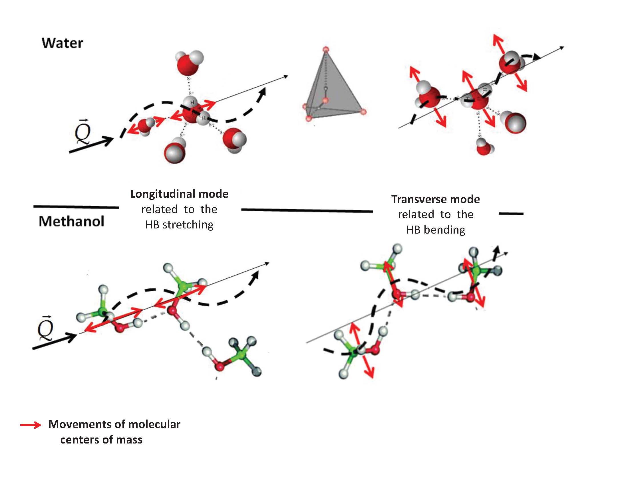 A pictorial representation of the coupling between the exchanged wavevector Q and the longitudinal and transverse waves propagating in water (tetrahedral) and methanol (non tetrahedral) is given in Fig. 3.