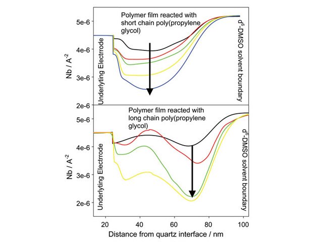 By using suitable reflectance angles, changes in film structure every 200-400 s could be measured. This allows one to probe how far molecules of different sizes are able to penetrate into the bulk of the polymer film and the extent to which the hydrolysis side-reaction occurs within the film. Both of these influence attributes such as a sensor’s specificity, sensitivity and temporal response.