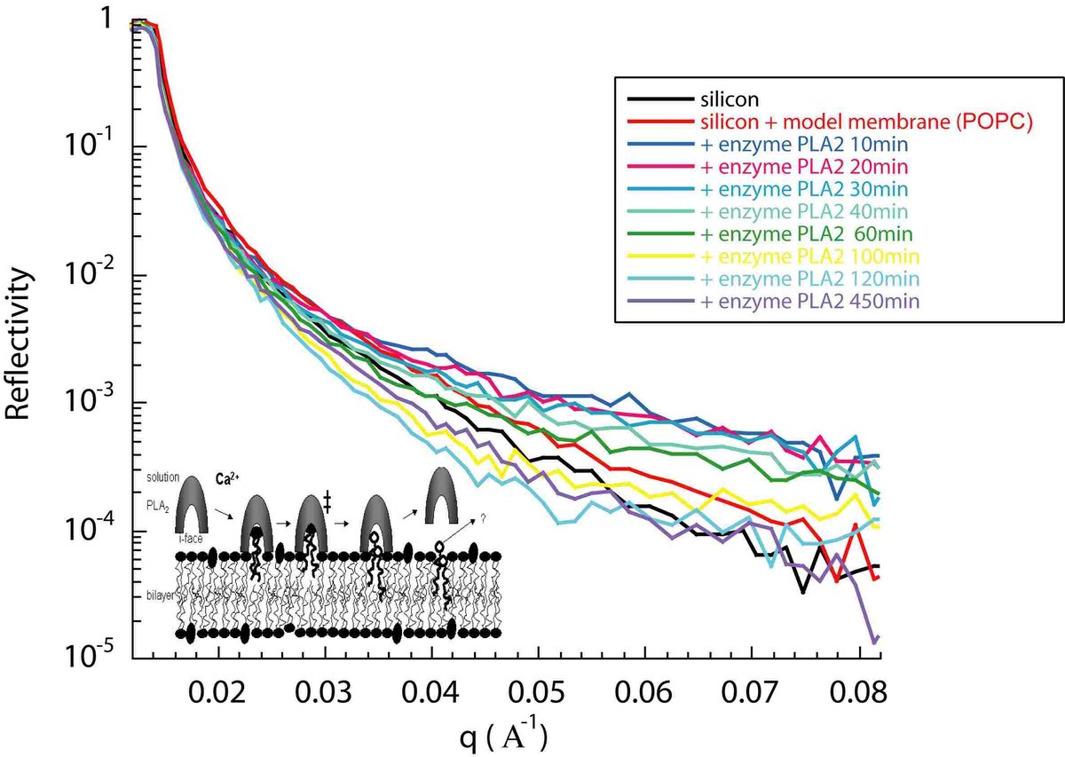 The example below shows a time dependent study of the interaction between a lipid film and the enzyme 'phospholipase A2' from cobra venom in a heavy water solution. The enzyme attacks the lipid, therefore the reflectivity profile changes as a function of time. The illustration in the figure shows a possible mechanism. Each data set, which took 10 minutes to collect, can be analyzed to determine the breakdown of the lipid. The lipid film was completely destroyed in about 8 hours.