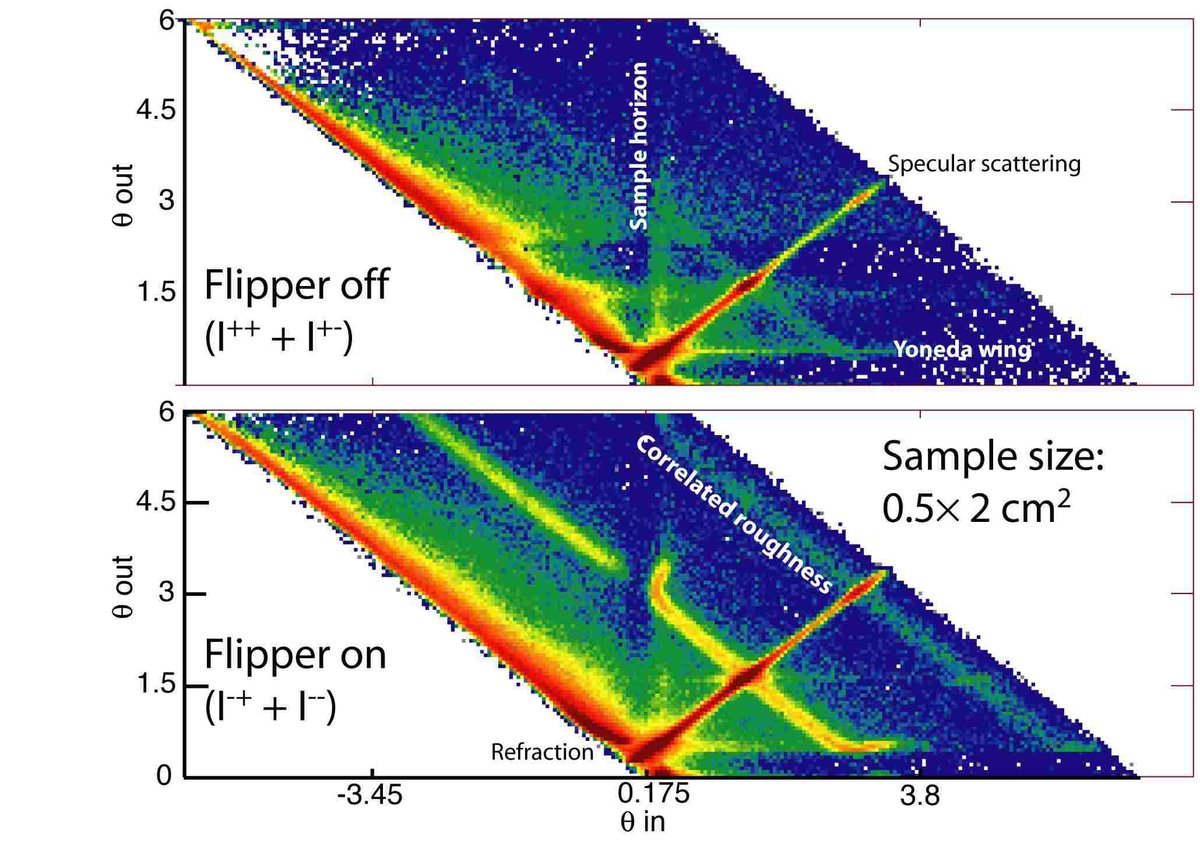 In addition to the specular reflection, which can be analysed to determine the magnetic properties of the film, a number of off-specular features are visible in the data. The features are clearly dependent on the polarization of the beam, in particular those features labeled 'correlated roughness', showing that they have a magnetic contribution.