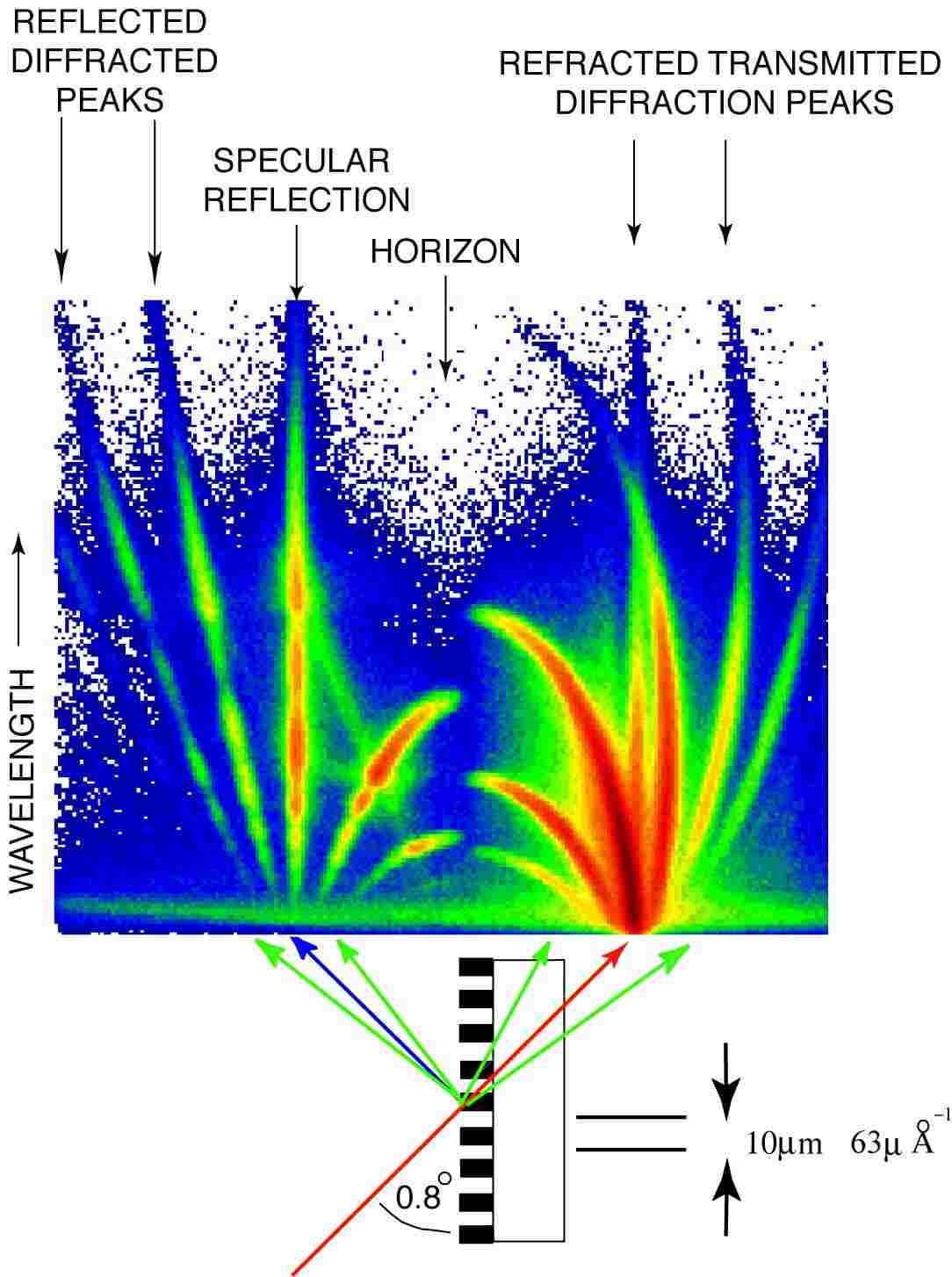 The reflected neutrons show a number of off-specular diffraction fringes, Yoneda wings, and diffuse scattering. Close examination of the specular reflection shows the interference fringes due to the thickness of the grating, which was 900Å. The picture therefore gives a good estimate of the coherence lengths of the instrument, which can probe films that are many tens of nanometers thick, and lateral structures that are micrometer sized.