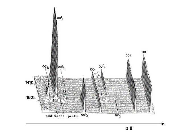 This evolution is plotted as a three-dimensional plot in the next figure, It is clear that there is magnetic phase transition at 162 and 141K. Above 161K, an antiferromagnetic order takes place as shown by the (00½) Bragg peak.