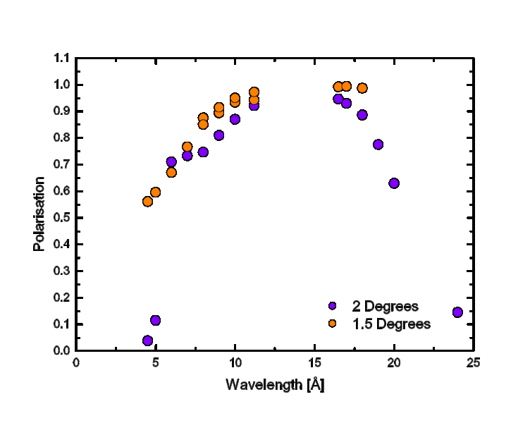 this suggests that (zero divergence) polarised neutrons should be available from 5.5 Å until both spin states are reflected by the silicon substrate at 40 Å. Figure 3a shows the measured flipping ratio and polarisation with the mirror at 2° and for a long collimation (17.6 m), i.e. very small beam divergence ~0.1°. Clearly, beam polarisation is only of high quality for wavelengths longer than ~10 Å where the measured flipping ratio exceeds FR > 10. Since beam the beam divergence is small, the main cause of the poor polarisation at shorter wavelengths is the poor reflectivity of the mirrors at large m-values. In reality, the mirrors used here have a reflectivity which falls from R=1 @ m = 0.5 to the sharp cutoff at R = 0.45 @ m = 3.6.