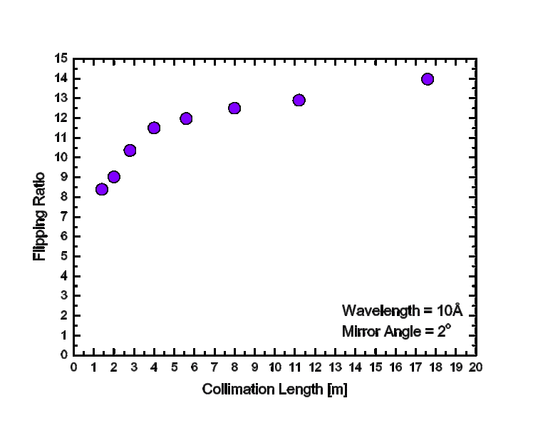Flipping ratio vs. collimation length for 10 Å neutrons and 2° mirror angle. Shorter collimation lengths result in worse beam polarisation due to increased beam divergence at the polariser and depolarisation due to the magnetic Nickel guides.