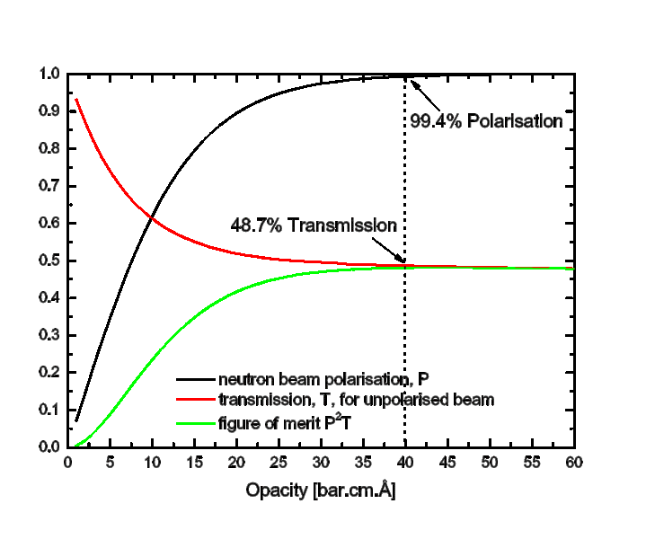 Calculated polarisation, transmission and P2T figure of merit for polarised 3He cell. Opacity is the product of cell pressure · cell thickness · wavelength.