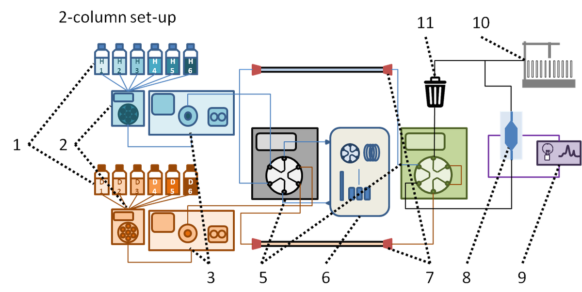 - one, more usual, with two columns enabling to equilibrate one column while eluting through the second one .