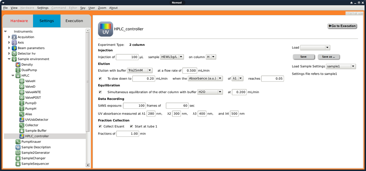 - HPLC controller tab to set the chromatography parameters with up to 4 wavelength for absorbance measurement and the options to equilibrate the non-eluting column, to slow down the elution at a specific absorbance threshold to enable SANS data accumulation and to collect eluted fractions