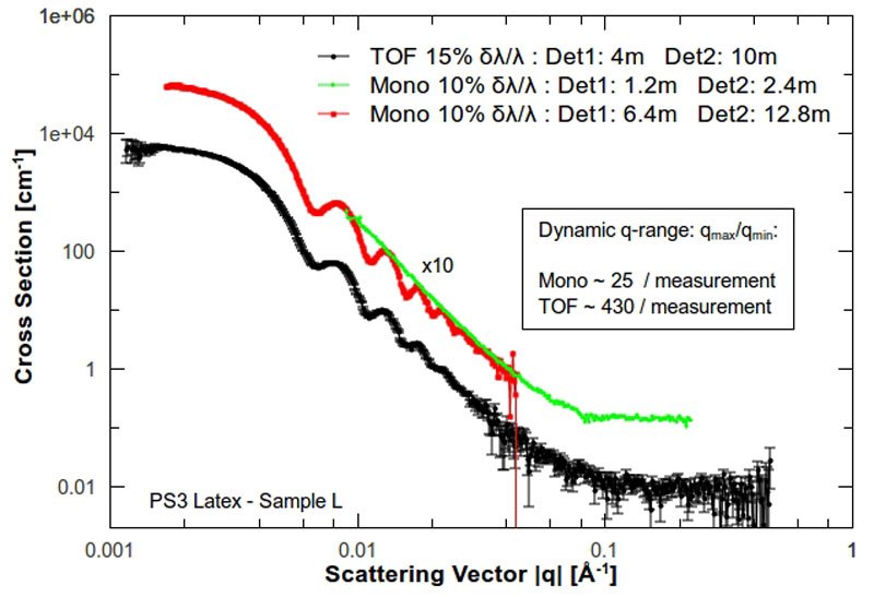The sample is a typical latex spheres sample in D2O measured in both Monochromatic and TOF modes for the same time taken.
