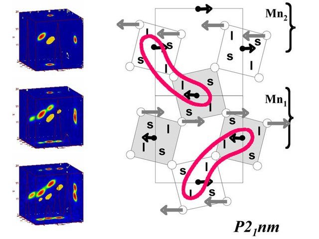 An example of the manifestation of twinning in the observed diffraction peaks is shown in figure (Fig. left column), together with the temperature evolution through the change of lattice parameters. The refinement of the obtained data reveals a new structural model which suggests the formation and ordering of ferromagnetic pairs of Mn atoms (Fig. right side) giving rise to a new interpretation of the electronic localization and the magnetic ordering in similar manganites. A D9-like diffractometer is the best tool for this purpose.