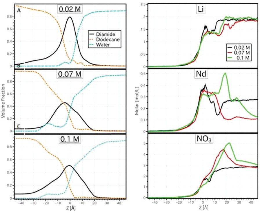 The combined application of neutron and X-ray reflectivity measurements represented a key milestone in the determination of the interfacial structure from two different lipophilic ligands. This combination is very helpful for understanding the microscopic structure at the LL interface. X-rays reveal the distribution of higher electron density aqueous solutes (salts, nitric acid), and neutrons are the perfect probes to quantify the structuration of protonated solvents and ligand molecules thanks to the use of isotopic substitution.