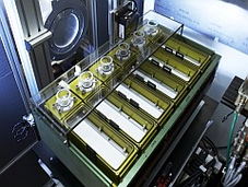 Solid/liquid interface cells are used to investigate the structure and composition of thin molecular films immersed in bulk liquids. Neutrons are transmitted through the solid substrate (i.e. a single crystal of silicon, quartz, or sapphire) and reflect from the bulk liquid at the solid/liquid interface. There are a range of cells that have been developed on FIGARO which are available for all users: 100 x 50 mm, 80 x 50 mm (most common; see picture left) or 50 x 50 mm. Fabricated from polyether ether ketone (PEEK), the base plate consists of a 0.5-mm deep solution reservoir, an o-ring for sealing to the substrate face, and inlet and outlet ports for solution exchange.