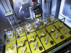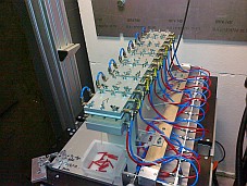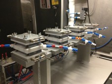 These components are sandwiched between aluminium plates containing with circulating water channels for temperature control. Up to 7 solid-liquid cells can be mounted simultaneously on the sample table and translated into the neutron beam. For maximum flexibility, it is possible to mount the crystals with the solid above the liquid (reflection up at the sample) or the liquid above the solid (reflection down at the sample). Solution changes can be automated through the instrument control software NOMAD using an HPLC pump and valve system (Knauer, Smartline; see picture centre) employing four independent input and six output lines.