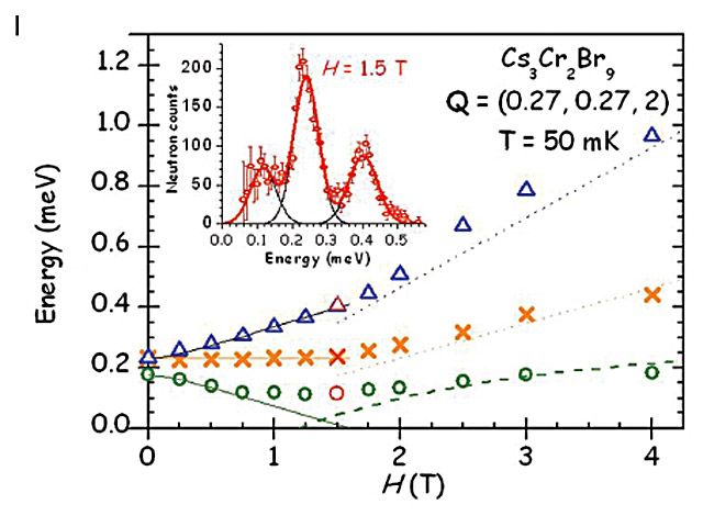 Cs3Cr2Br9 provides an example of a three dimensional interacting spin-dimer system (s=3/2) where the ground state (G.S.) is an S = 0 singlet state and the first excited state, an S = 1 triplet, is separated from the G.S. by an energy gap Δ≈0.2 meV.