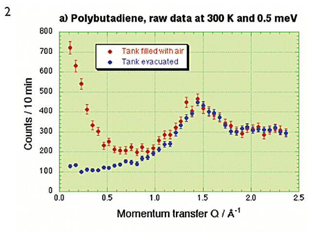 Such possibility is illustrated in this study of amorphous polybutadiene above the glass transition. Data collected with and without the vacuum tank are shown in the figure. The observation of modes at low Q provides information on microscopic parameters that allow a connection between the glass anomalies and the properties of the melt...