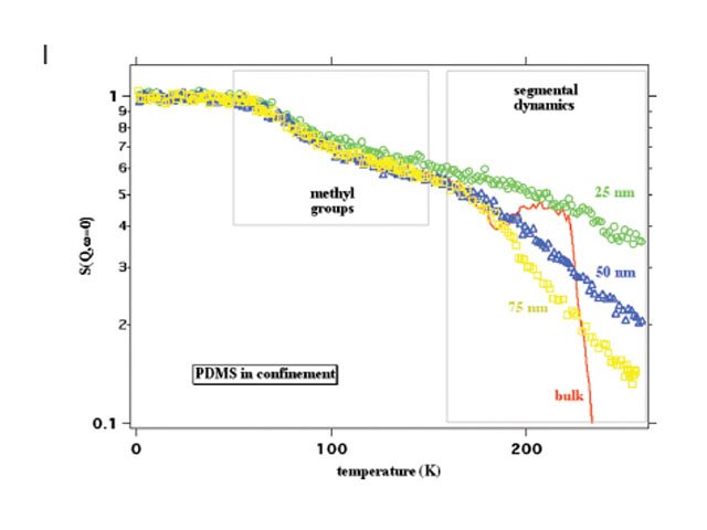 The elastic scans shown illustrate how local methyl group dynamics and extended segmental dynamics of a polymer are differently influenced by spatial restrictions in a porous material. It can also be seen that the crystallisation (upwards jump for bulk) is suppressed when confinement volume is sufficiently small (see figure).