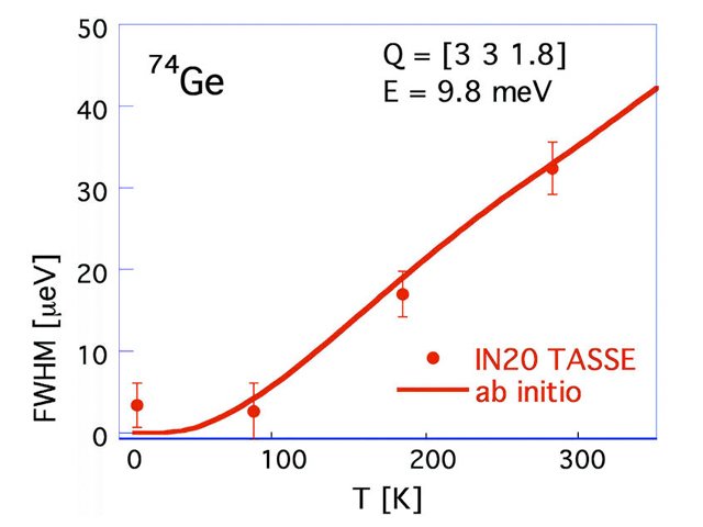 The IN20 spin-echo (TASSE) measurements on an isotopic crystal of 74Ge have revealed their metastable character (line-width close to zero) below 100 K. This was confirmed by subsequent ab initio calculations: the phonons required by the only possible difference process of decay are not thermally populated at such low temperatures.