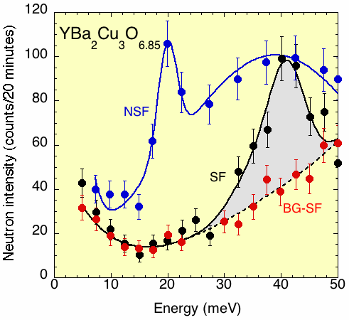 In the opposite figure, the energy dependence of the background is due to the increased counting time at higher incident energies. The shaded area illustrates the magnetic signal peaking at the resonance position of 41 meV.